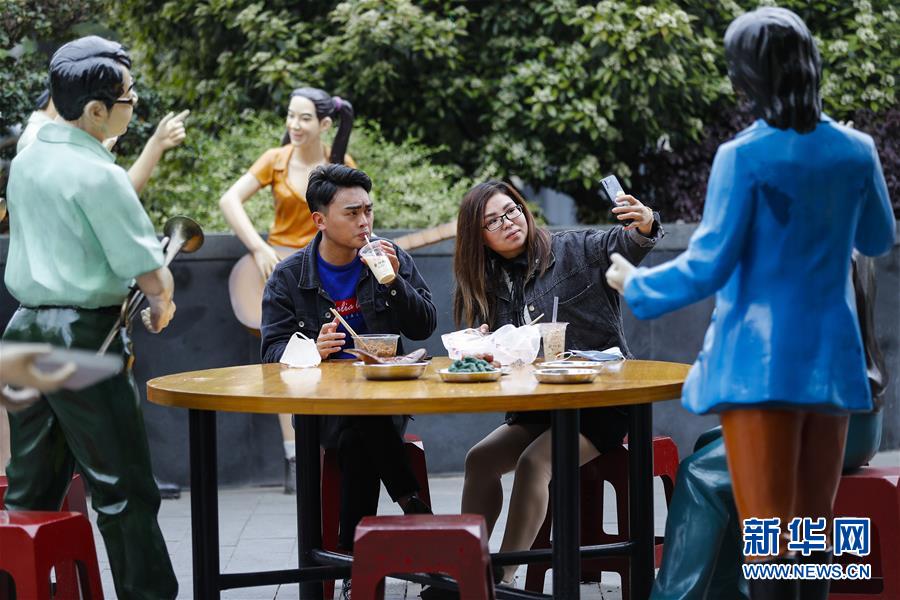 4月5日,人們?cè)谖錆h市吉慶街的“大排檔”雕塑旁吃熱干面。新華社記者沈伯韓攝