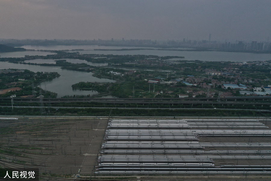 2020年4月6日,武漢動(dòng)車段高鐵動(dòng)車組整裝待發(fā)(無(wú)人機(jī)照片)。