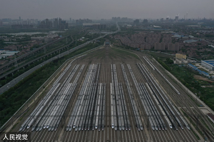 2020年4月6日,武漢動車段高鐵動車組整裝待發(fā)(無人機照片)。