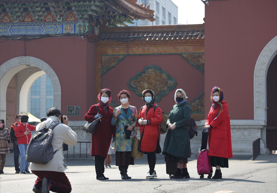 2020年4月6日,遼寧沈陽(yáng),北陵公園在清明小長(zhǎng)假的最后一天,游客猛增。市民對(duì)各項(xiàng)游戲都踴躍參與。圖為伴著歡快優(yōu)美的樂(lè)曲,大爺大媽們紛紛起舞。