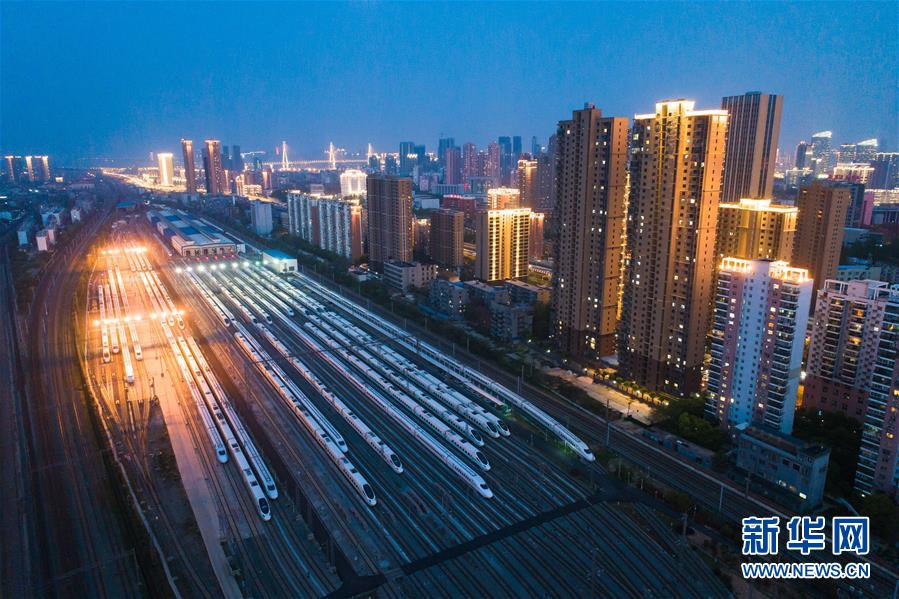 4月7日,在武漢動(dòng)車段,列車??吭诖孳嚲€上(無(wú)人機(jī)照片)。 新華社記者 肖藝九 攝