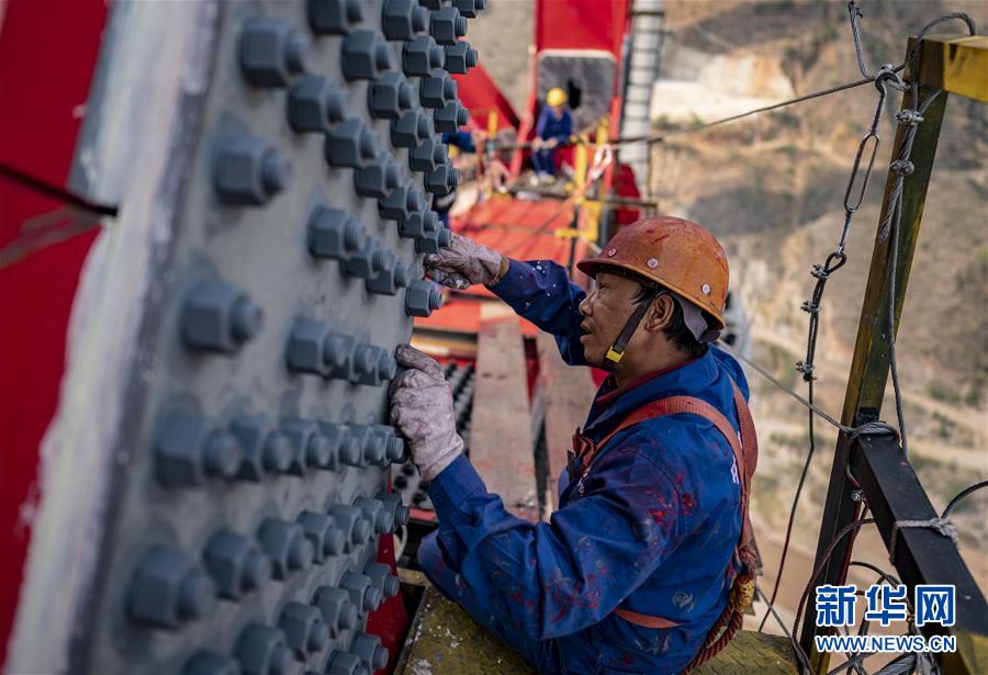 在位于普洱市的木乃河雙線特大橋工程現(xiàn)場,工人鐘琪在檢查螺絲緊固情況(4月12日攝)。新華社記者秦晴攝