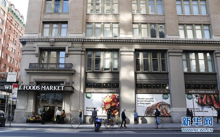 3月21日,在美國紐約,人們排隊時保持距離,準(zhǔn)備進(jìn)入一家超市購物。新華社記者王迎攝