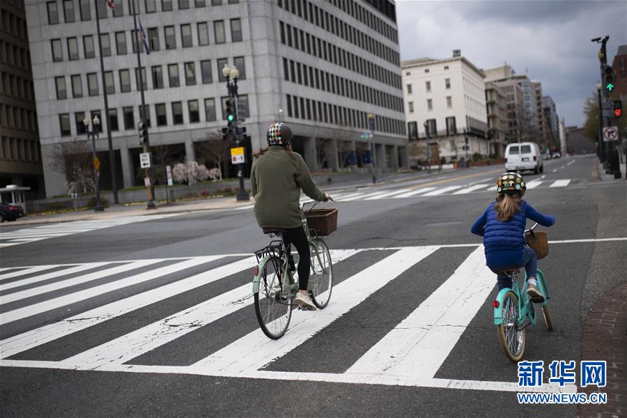 4月1日,在美國首都華盛頓,兩名市民在白宮附近的一條馬路上騎車。新華社記者劉杰攝