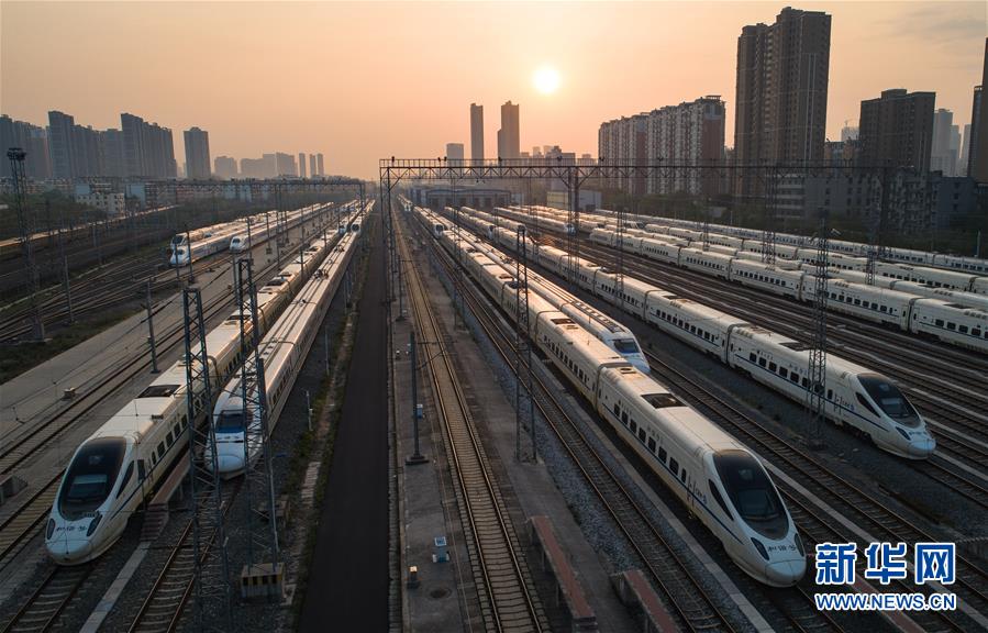 4月8日,在武漢動(dòng)車段,列車??吭诖孳嚲€上準(zhǔn)備投入運(yùn)行(無(wú)人機(jī)照片)。新華社記者肖藝九攝