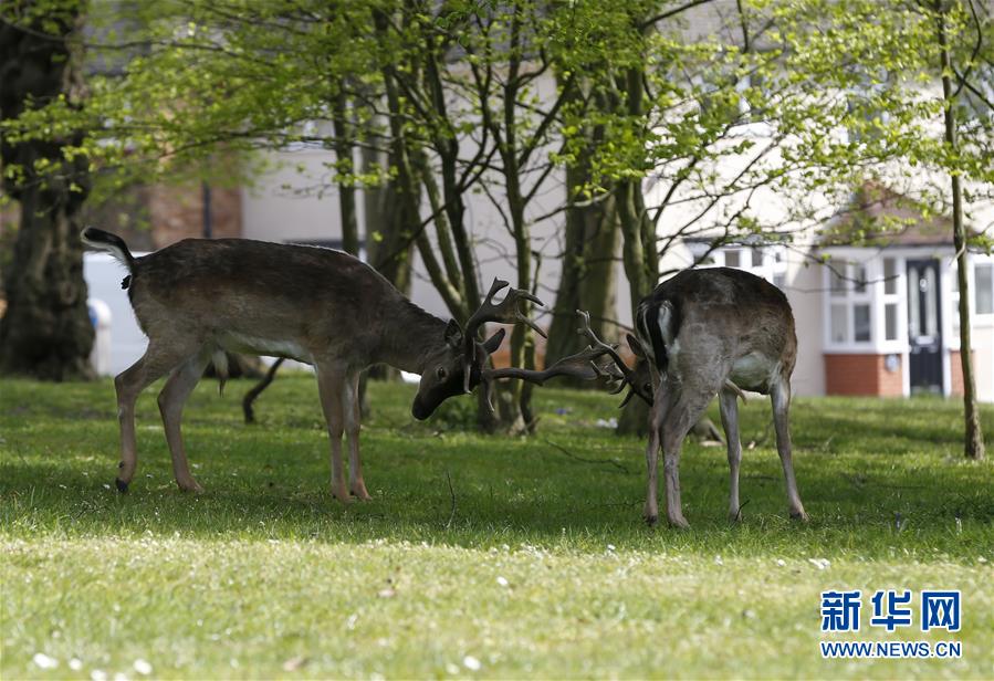4月8日,在英國倫敦東部一個居民區(qū),附近公園里的鹿在草坪上駐足。隨著新冠疫情在英國的擴(kuò)散,政府要求人們減少不必要的外出。倫敦東部一個居民區(qū)附近公園里原來散養(yǎng)的鹿紛紛從公園走出來,或吃草或接受附近居民的喂食,成為特殊時期居民區(qū)里的新“客人”。新華社記者韓巖攝