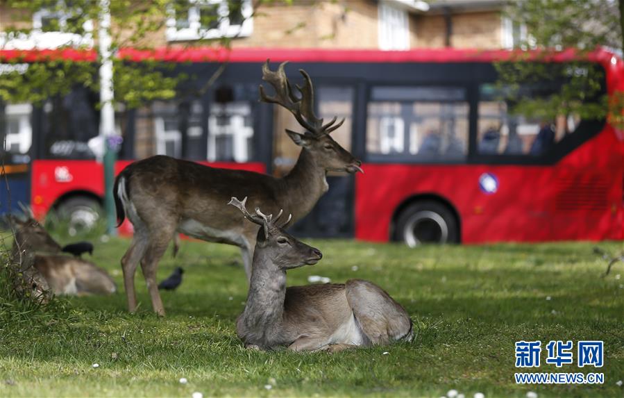 4月8日,在英國倫敦東部一個居民區(qū),附近公園里的鹿在草坪上休息。隨著新冠疫情在英國的擴(kuò)散,政府要求人們減少不必要的外出。倫敦東部一個居民區(qū)附近公園里原來散養(yǎng)的鹿紛紛從公園走出來,或吃草或接受附近居民的喂食,成為特殊時期居民區(qū)里的新“客人”。新華社記者韓巖攝