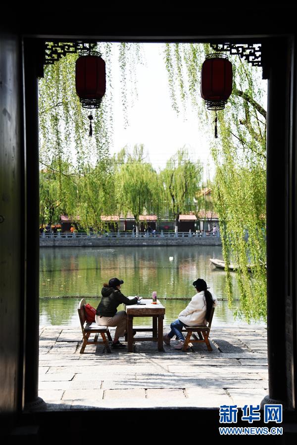 4月13日,游客在濟(jì)南百花洲歷史文化街區(qū)休閑。新華社記者王凱攝