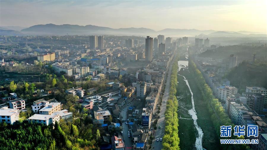 4月13日清晨時(shí)分拍攝的洛南縣城(無(wú)人機(jī)照片)。新華社記者陶明攝