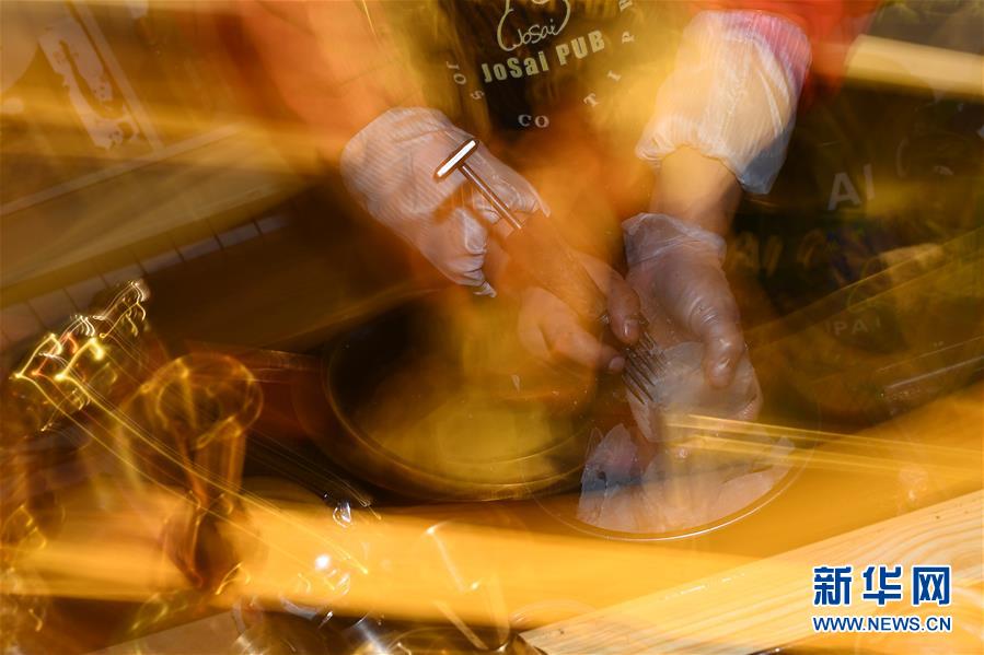 4月8日,才仁俄賽在餐廳內(nèi)制作調(diào)酒使用的冰塊。新華社記者張宏祥攝