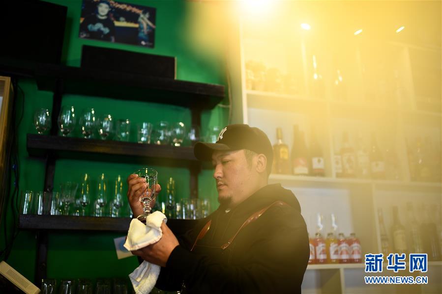 4月10日,才仁俄賽在餐廳中清潔酒具。新華社記者張宏祥攝