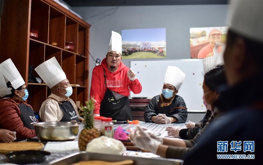 4月2日,才仁俄賽(左三)在玉樹(shù)脊髓損傷者“希望之家”做志愿者,為脊髓損傷者講解披薩制作過(guò)程。新華社記者吳剛攝