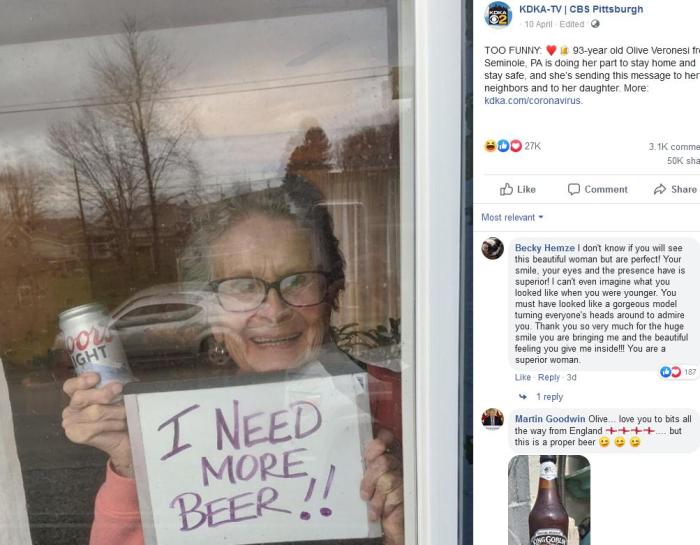 據(jù)報(bào)道,老太太表示,自州長下令居家避疫后,她盡好公民本分,未曾離開家門。但后來眼見只剩兩罐啤酒,于是想出這個辦法向鄰居及女兒求援,不料獲得廠商關(guān)注,老太太最終獲啤酒商贈送150罐啤酒,并留下有趣組圖。