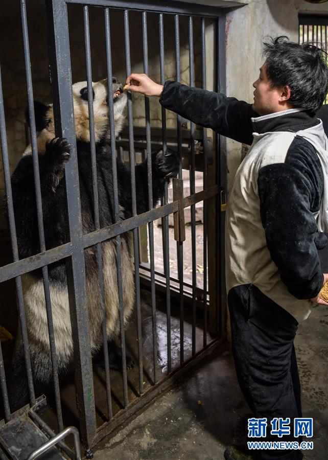 4月14日,中國大熊貓保護(hù)研究中心核桃坪基地飼養(yǎng)員周季秋用投喂窩窩頭的方法訓(xùn)練大熊貓“喜妹”。新華社記者張超群攝