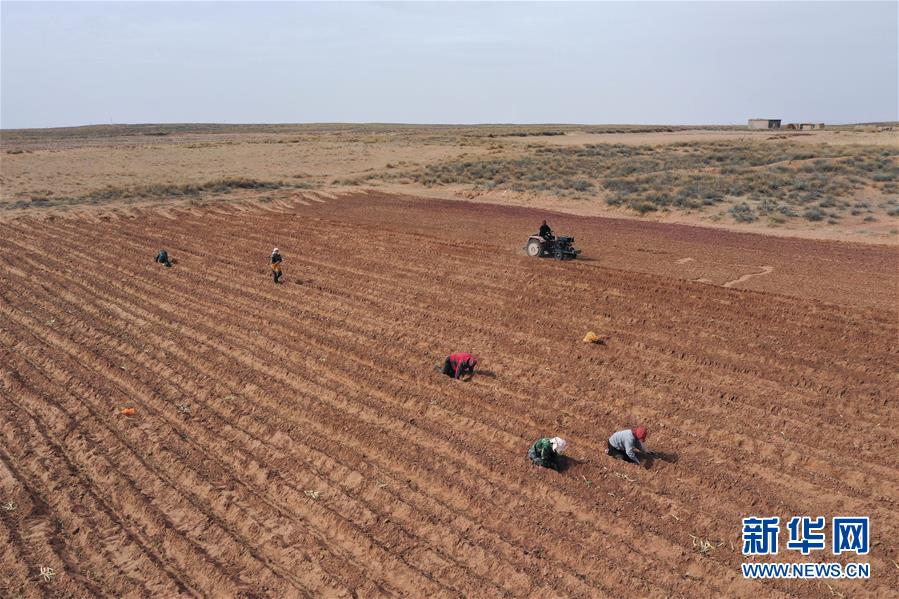 4月15日,農(nóng)民在杭錦旗道勞呼都格嘎查的農(nóng)田里勞作(無人機照片)。春種時節(jié),在內(nèi)蒙古鄂爾多斯市杭錦旗道勞呼都格嘎查,農(nóng)民忙著播種紅蔥。在鄂爾多斯高原種植的紅蔥耐旱耐寒,具有較好的經(jīng)濟效益。新華社記者徐欽攝