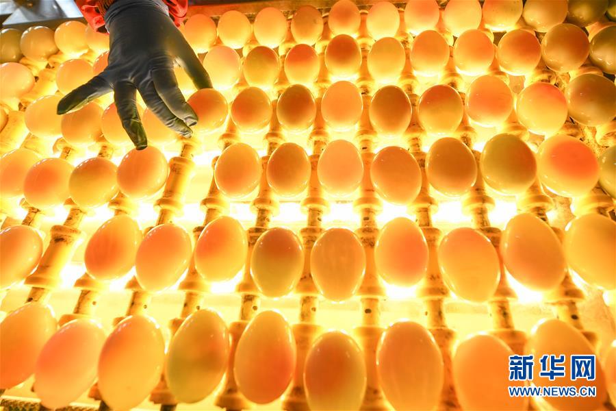 江蘇高郵鴨集團的工作人員在生產(chǎn)線上對鴨蛋進行光檢作業(yè)(4月15日攝)?!案哙]鴨蛋”是江蘇高郵的特色農(nóng)業(yè)名片。近年來,當(dāng)?shù)卦诹挤N繁育、生態(tài)養(yǎng)殖、產(chǎn)品加工等方面加大力度,推動高郵鴨蛋品牌化建設(shè),讓小鴨蛋成為帶動農(nóng)戶致富的大產(chǎn)業(yè)。2019年,高郵市共計生產(chǎn)熟制鴨蛋產(chǎn)品近11.2億枚,年產(chǎn)值近17.68億元。新華社記者李博攝