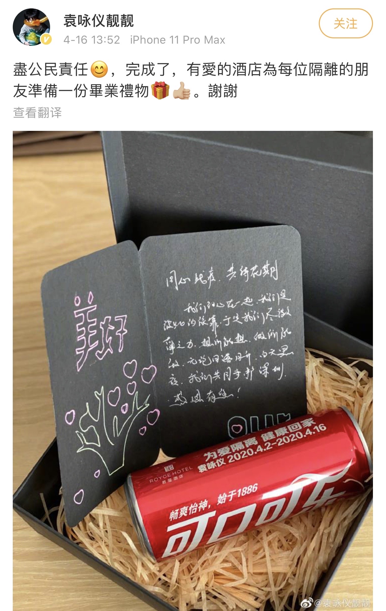 近日,香港藝人袁詠儀發(fā)了一條微博,曬出了一份特別的“畢業(yè)禮物”,這是深圳一酒店為每位結(jié)束隔離的公民準(zhǔn)備的,除了有一瓶“為愛(ài)隔離、健康回家”的飲料,還有一張“同心戰(zhàn)疫、共待花期”的暖心賀卡。