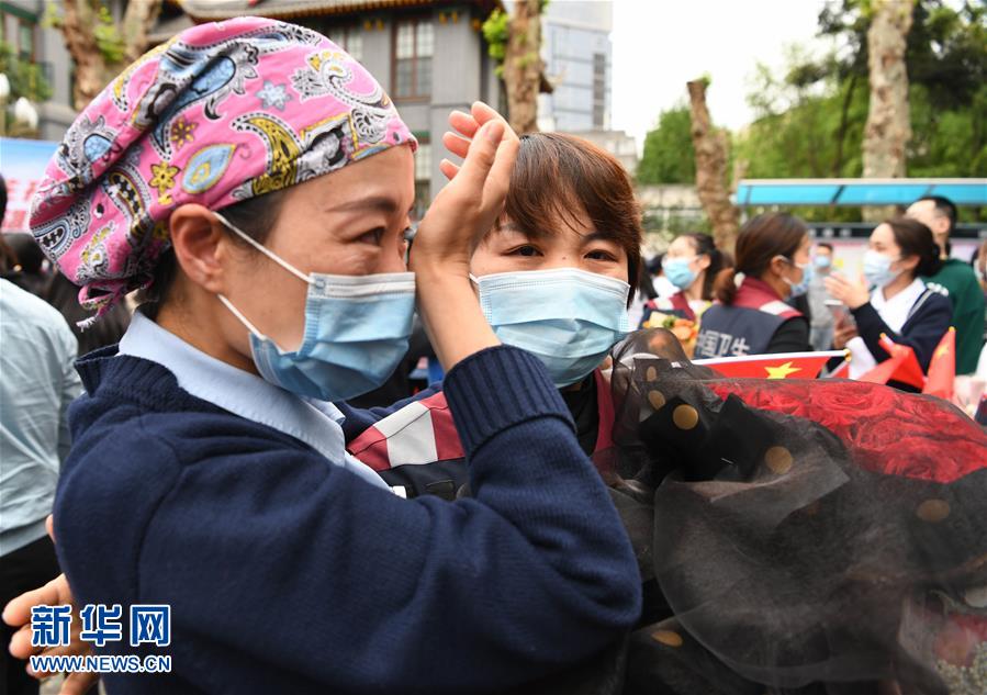 4月21日,在四川大學(xué)華西醫(yī)院,醫(yī)療隊隊員安慰流淚的同事。當日,來自四川大學(xué)華西醫(yī)院、華西第二醫(yī)院、華西第四醫(yī)院的醫(yī)療隊隊員解除隔離休整,與分別許久的家人、同事團聚,緊緊相擁。新華社記者王曦攝
