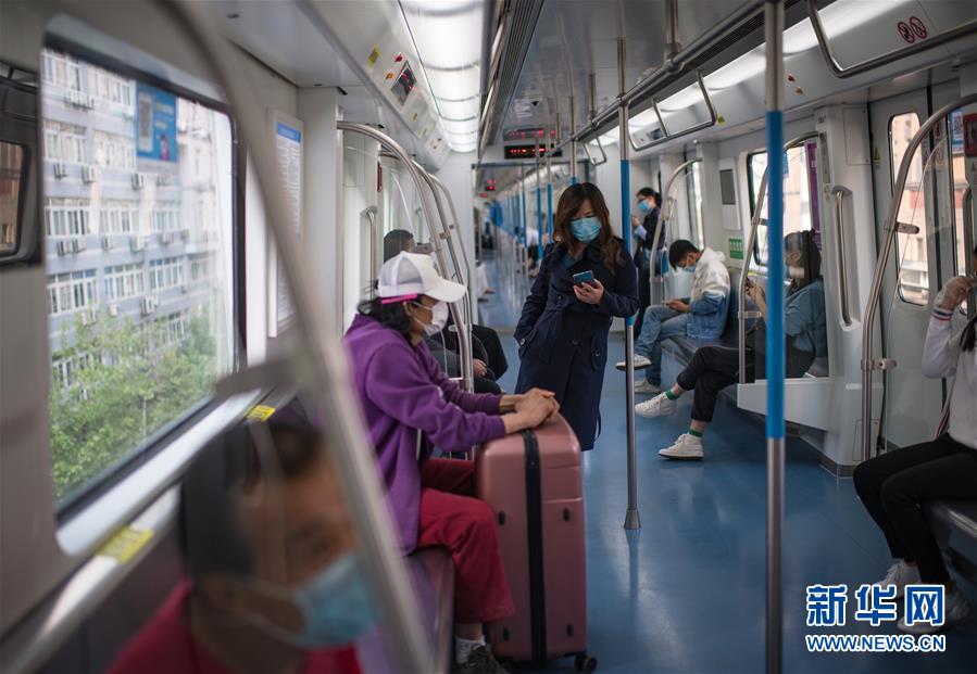 4月16日,武漢市民保持距離乘坐軌道交通一號(hào)線列車。新華社記者肖藝九攝