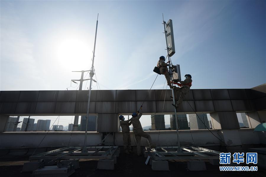 4月25日,在南京220千伏城南河變電站屋頂,工人在架設(shè)5G設(shè)備。當(dāng)日,三大通信運營商的2座5G、3座4G基站建設(shè)工作在南京220千伏城南河變電站屋頂有序展開。在變電站內(nèi)建設(shè)基站可有效利用電網(wǎng)資源,縮短建設(shè)周期,節(jié)約建設(shè)成本。新華社記者季春鵬攝