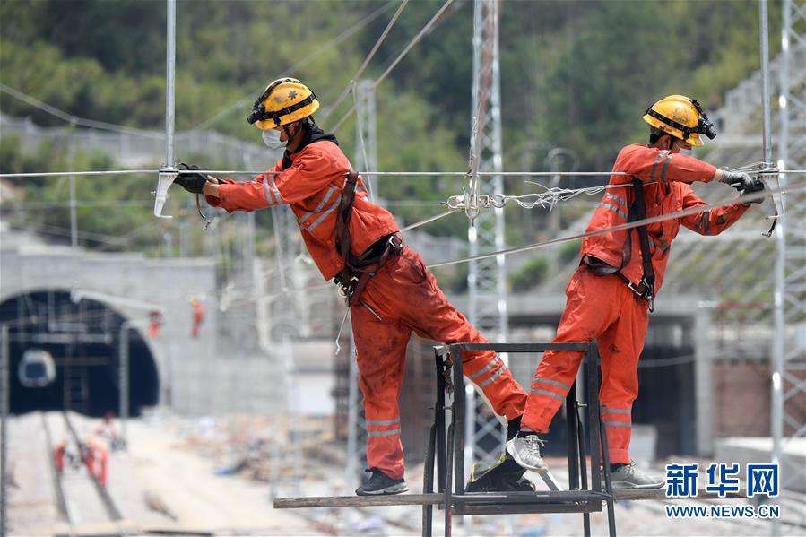 4月25日,在福建省寧德市屏南車站,施工人員開展接觸網(wǎng)調(diào)整作業(yè)。中鐵電氣化局集團上海公司推動衢寧鐵路福建段通信工程、信號工程、電力工程、電氣化工程各環(huán)節(jié)協(xié)同復工復產(chǎn),目前來自河北、河南、四川等國內(nèi)10個省的900多名員工返崗就業(yè)。衢寧鐵路北起浙江省衢州市,南至福建省寧德市,全長379.2公里。新華社記者彭張青攝