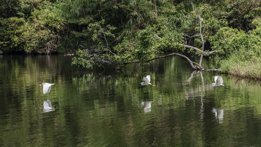 4月15日,攝于南山區(qū)華僑城天鵝堡附近。這是深圳拍鷺鳥(niǎo)的其中一個(gè)好去處。左一白鷺捕到食物,后方兩只白鷺追趕。徐捷