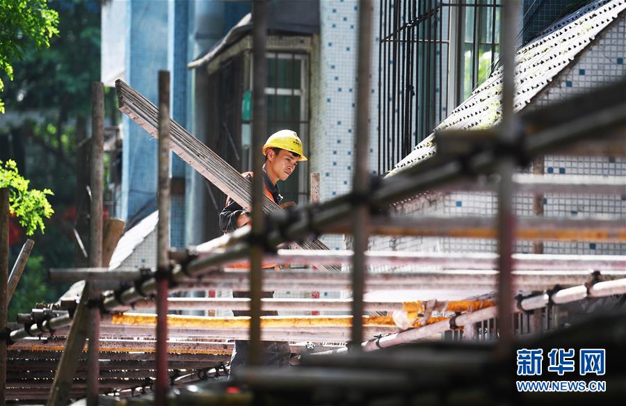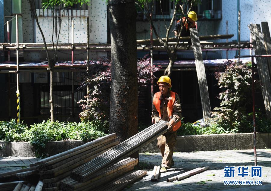 4月26日,工人在渝中區(qū)大溪溝街道雙鋼路社區(qū)改造提升項目施工現(xiàn)場作業(yè)。近段時間以來,重慶市渝中區(qū)大溪溝街道加快推進轄區(qū)內(nèi)老舊小區(qū)改造提升工作,從環(huán)境衛(wèi)生、房屋管理及養(yǎng)護、安防及車輛管理、綠化管理等方面進行綜合改造提升,以增強社區(qū)居民的幸福感、獲得感、安全感。新華社記者王全超攝