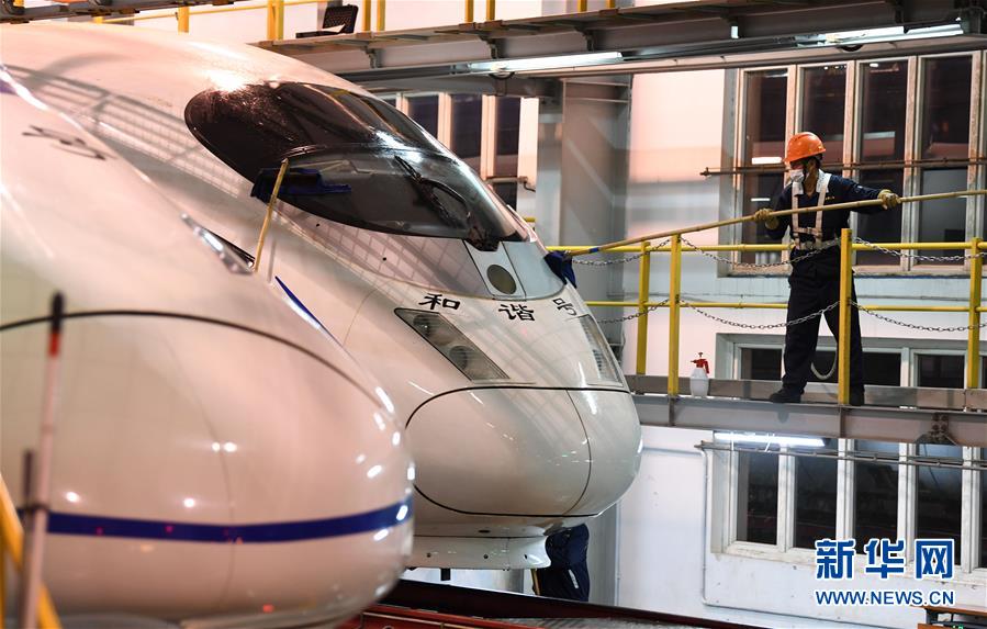 4月29日夜,工作人員在合肥南動(dòng)車運(yùn)用所內(nèi)對(duì)動(dòng)車組進(jìn)行清潔。每當(dāng)夜深人靜的時(shí)候,合肥南動(dòng)車運(yùn)用所卻燈火通明,“動(dòng)車安全守護(hù)者”們堅(jiān)守崗位,對(duì)動(dòng)車組進(jìn)行全面細(xì)致檢修。新華社記者 劉軍喜 攝