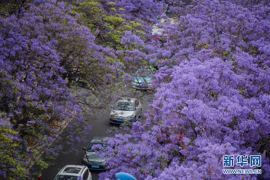 這是5月2日在昆明市教場中路拍攝的藍(lán)花楹。近日,云南省昆明市部分街區(qū)的藍(lán)花楹競相開放,為春城增添靚麗風(fēng)景。新華社記者藺以光攝