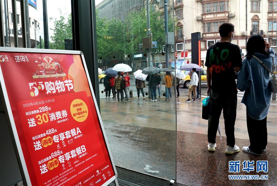 上海淮海路一家商場(chǎng)布置的“五五購(gòu)物節(jié)”活動(dòng)信息(5月5日攝)。5月4日晚,上海首次啟動(dòng)大規(guī)模商業(yè)促銷活動(dòng)“五五購(gòu)物節(jié)”,多家在線新經(jīng)濟(jì)企業(yè)參與,通過(guò)線上流量?jī)?yōu)勢(shì)反哺線下賣場(chǎng),實(shí)現(xiàn)電商與實(shí)體零售融合互動(dòng),激活消費(fèi)潛力、驅(qū)動(dòng)消費(fèi)復(fù)蘇。據(jù)“上海發(fā)布”的消息,截至5日14時(shí)12分,“五五購(gòu)物節(jié)”上海地區(qū)消費(fèi)支付總額已超100億元。新華社記者劉穎攝