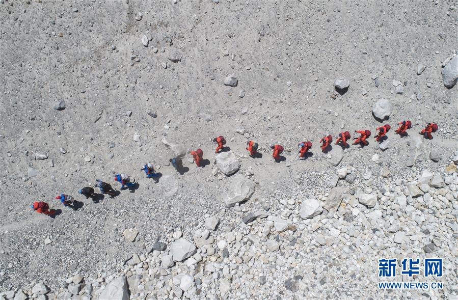 5月6日,登山隊員們向更高海拔進發(fā)(無人機照片)。新華社記者晉美多吉攝