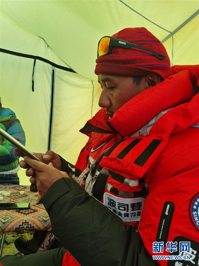 5月7日,登山隊(duì)隊(duì)長次洛在前進(jìn)營地查看攀登計(jì)劃。當(dāng)日,2020珠峰高程測量登山隊(duì)抵達(dá)海拔6500米的前進(jìn)營地后,測量登山隊(duì)同由西藏圣山登山探險(xiǎn)服務(wù)有限公司的高山向?qū)Ш蛥f(xié)作隊(duì)員組成的修路隊(duì)、運(yùn)輸隊(duì)召開協(xié)調(diào)會議,布置下一步任務(wù)。新華社特約記者扎西次仁攝