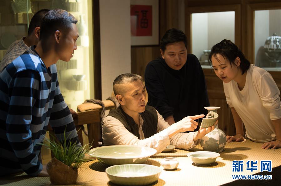 5月8日,項(xiàng)宏金(左一)在龍泉青瓷裝飾紋樣研究所向來訪的年輕瓷人介紹一件貫耳瓶。1965年出生的項(xiàng)宏金,被浙江龍泉年輕一代瓷人稱為“項(xiàng)哥”,他從20世紀(jì)90年代開始收集龍泉青瓷標(biāo)本,研究青瓷紋樣。2014年出版著作《龍泉青瓷裝飾紋樣》,次年開設(shè)龍泉青瓷裝飾紋樣研究所,將自己收藏的千余件標(biāo)本跟瓷器愛好者、創(chuàng)作者免費(fèi)分享。新華社記者翁忻旸攝