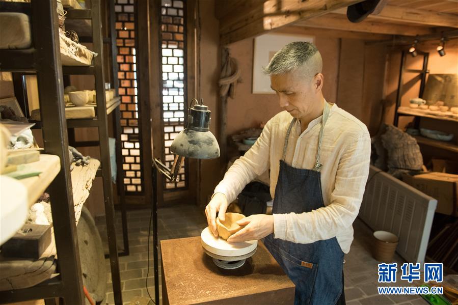 5月8日,項宏金在龍泉青瓷裝飾紋樣研究所捏制器皿。1965年出生的項宏金,被浙江龍泉年輕一代瓷人稱為“項哥”,他從20世紀90年代開始收集龍泉青瓷標本,研究青瓷紋樣。2014年出版著作《龍泉青瓷裝飾紋樣》,次年開設龍泉青瓷裝飾紋樣研究所,將自己收藏的千余件標本跟瓷器愛好者、創(chuàng)作者免費分享。新華社記者翁忻旸攝