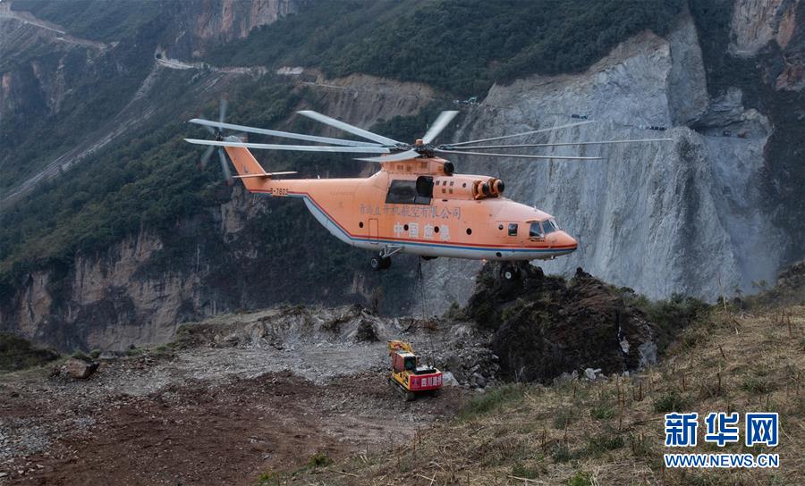一架米-26重型直升機(jī)在布拖縣阿布洛哈村吊運(yùn)挖掘機(jī)(2019年12月5日攝)。新華社記者江宏景攝