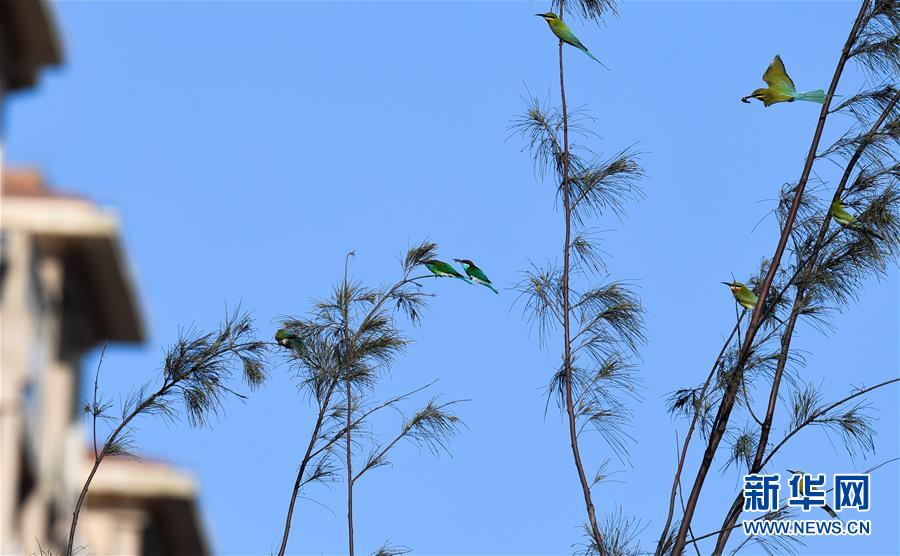 近日,百余只栗喉蜂虎和少量藍喉蜂虎來到海南省??谑形骱0抖鄠€地點棲息繁衍,為椰城增添一抹亮色。據(jù)了解,蜂虎每年春夏都會回到固定地點繁殖,由于習(xí)性特殊,蜂虎需要在新形成的沙質(zhì)土坡上做窩。為此,??谑邢嚓P(guān)部門每年在蜂虎到來之前,會在蜂虎棲息地整坡清樹,為蜂虎營造良好的棲息環(huán)境。