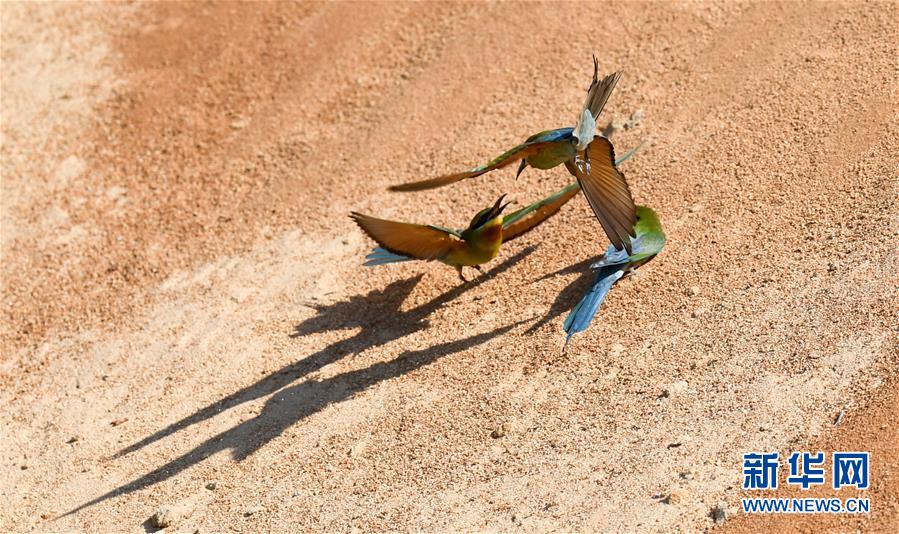 在??谖逶春酉掠畏浠⒈Wo小區(qū),栗喉蜂虎在沙質(zhì)土坡上起飛(5月7日攝)。新華社記者楊冠宇攝