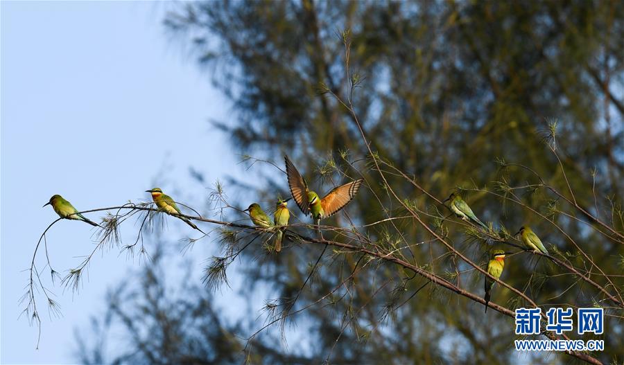 在海口五源河下游蜂虎保護小區(qū),栗喉蜂虎在樹枝上休息(5月7日攝)。新華社記者楊冠宇攝