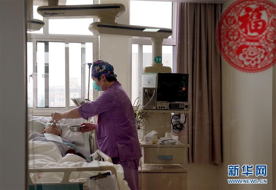 5月10日,在上海市普陀區(qū)中心醫(yī)院內(nèi)科重癥監(jiān)護室,護士金鑫給患者喂飯。新華社記者劉穎攝