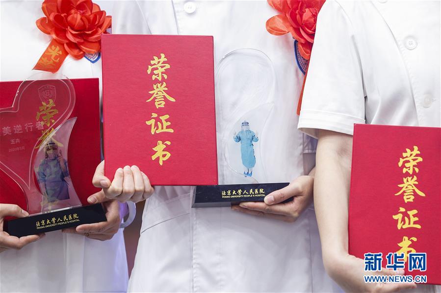 5月11日,獲獎(jiǎng)護(hù)士在護(hù)士節(jié)活動(dòng)上手捧獎(jiǎng)杯和證書(shū)。在國(guó)際護(hù)士節(jié)到來(lái)之際,北京大學(xué)人民醫(yī)院11日舉辦慶祝護(hù)士節(jié)暨優(yōu)秀集體和個(gè)人表彰活動(dòng),并邀請(qǐng)?jiān)踽t(yī)療隊(duì)護(hù)士代表分享戰(zhàn)“疫”故事。我國(guó)今年護(hù)士節(jié)的主題為“致敬護(hù)士隊(duì)伍,攜手戰(zhàn)勝疫情”。新華社記者張玉薇攝