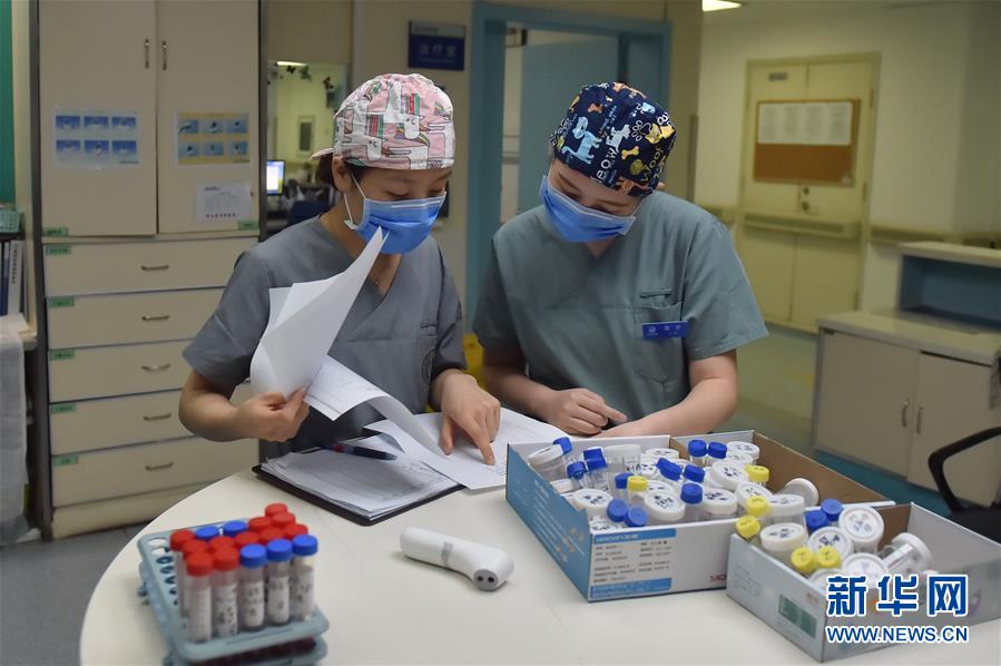 5月11日,在北京地壇醫(yī)院感染二科護士站,護士王蕊(左)和石淼在整理病人的核酸樣本。北京地壇醫(yī)院是北京市收治新冠肺炎患者的定點醫(yī)院之一,醫(yī)院的醫(yī)護人員一直奮戰(zhàn)在抗擊疫情的一線。在國際護士節(jié)前夕,記者前往北京地壇醫(yī)院,記錄下抗疫一線護士的日常工作狀態(tài)。新華社記者彭子洋攝