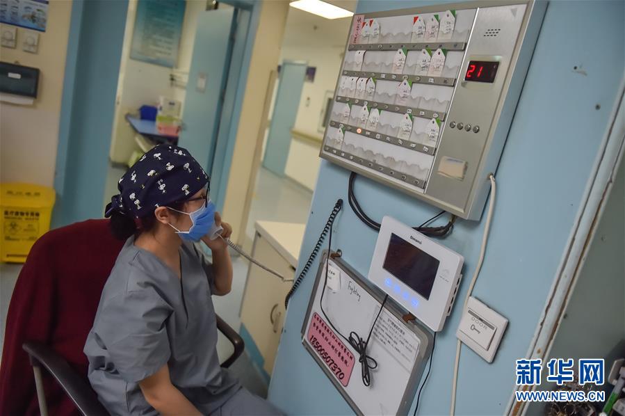 5月11日,在北京地壇醫(yī)院感染二科護(hù)士站,護(hù)士彭蒨接聽(tīng)病房呼喚鈴電話(huà)。北京地壇醫(yī)院是北京市收治新冠肺炎患者的定點(diǎn)醫(yī)院之一,醫(yī)院的醫(yī)護(hù)人員一直奮戰(zhàn)在抗擊疫情的一線(xiàn)。在國(guó)際護(hù)士節(jié)前夕,記者前往北京地壇醫(yī)院,記錄下抗疫一線(xiàn)護(hù)士的日常工作狀態(tài)。新華社記者彭子洋攝