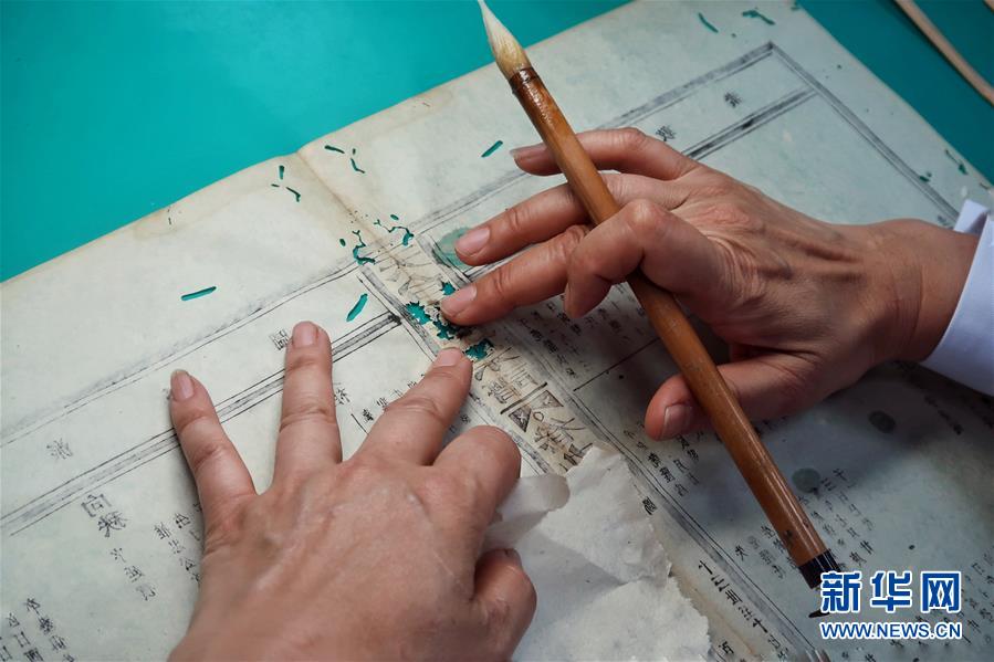 5月13日,天一閣藏品修復(fù)部主任王金玉在對(duì)書頁進(jìn)行修復(fù)。天一閣藏品修復(fù)部目前有修復(fù)師14人,每年約修復(fù)古籍14000余頁。據(jù)介紹,修復(fù)一冊(cè)古籍通常需要1至2個(gè)月,有的甚至需要1年以上。新華社記者鄭夢(mèng)雨攝