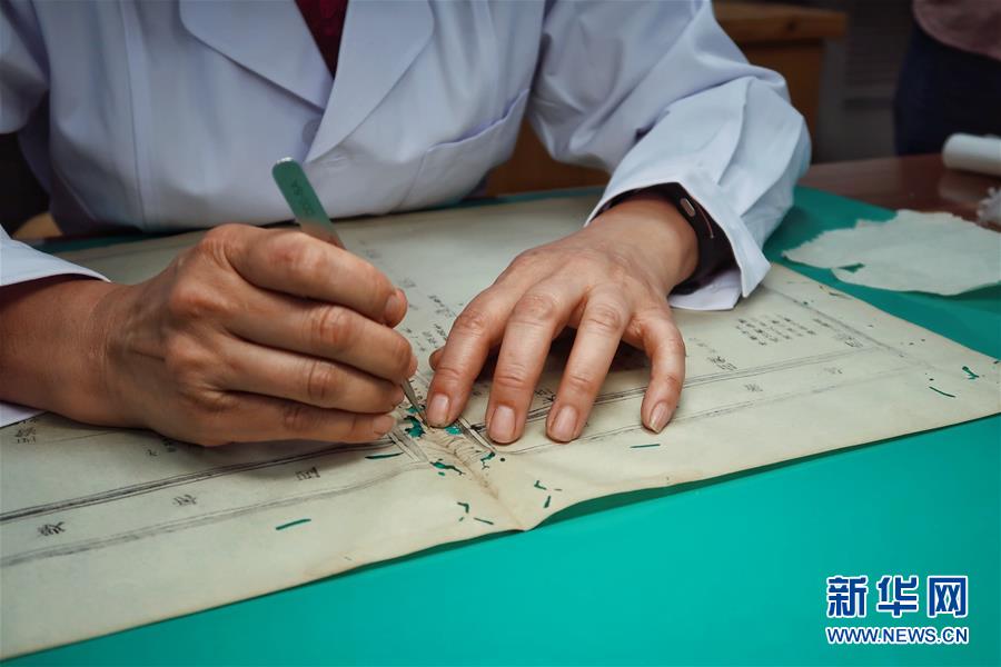 5月13日,天一閣藏品修復部主任王金玉在對書頁進行修復。天一閣藏品修復部目前有修復師14人,每年約修復古籍14000余頁。據介紹,修復一冊古籍通常需要1至2個月,有的甚至需要1年以上。新華社記者鄭夢雨攝
