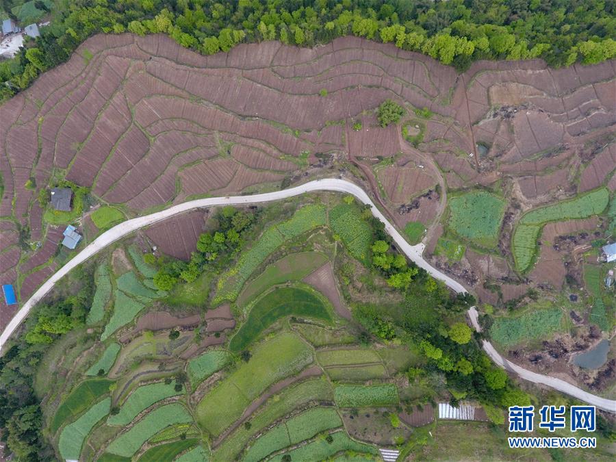 這是4月1日拍攝的龍臺村部分土地(無人機(jī)照片)。圖中上半部分為已種上中藥材的新整土地,下半部分為該村種植的傳統(tǒng)作物。新華社記者劉坤攝