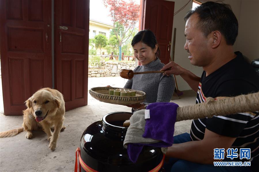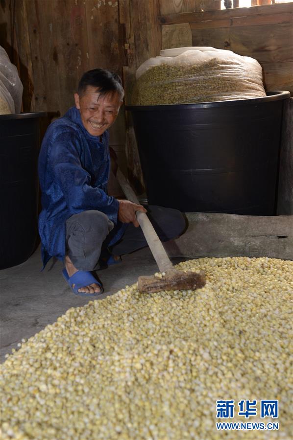 5月14日,在貴州省畢節(jié)市百里杜鵑管理區(qū)黃泥鄉(xiāng)龍?zhí)链逡患揖谱鞣?,村民對玉米進行發(fā)酵。貴州省畢節(jié)市百里杜鵑管理區(qū)黃泥鄉(xiāng)龍?zhí)链宓凝執(zhí)凉啪?,因獨特的古法釀酒技術,口感獨特而遠近聞名。全村有釀酒戶142戶,年產(chǎn)量達45萬多公斤,龍?zhí)凉啪七h銷重慶、廣東、浙江等地,龍?zhí)凉啪埔殉蔀辇執(zhí)寥嗽鍪盏闹匾獊碓础P氯A社記者楊楹攝