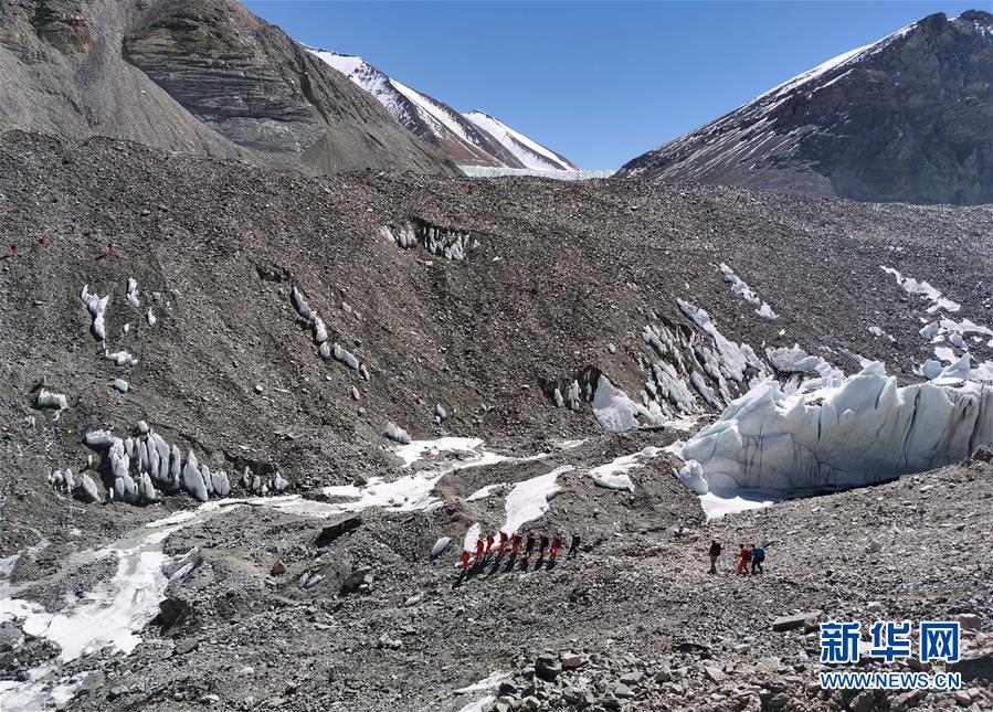 2020珠峰高程測(cè)量登山隊(duì)在前往海拔6500米的前進(jìn)營(yíng)地途中(5月17日攝)。5月17日11時(shí)左右,2020珠峰高程測(cè)量登山隊(duì)從海拔5800米的過(guò)渡營(yíng)地出發(fā),用時(shí)近5個(gè)小時(shí),到達(dá)海拔6500米的珠峰前進(jìn)營(yíng)地。據(jù)2020珠峰高程測(cè)量登山隊(duì)隊(duì)長(zhǎng)次落介紹,5月18日,隊(duì)伍將在前進(jìn)營(yíng)地進(jìn)行休整,并將對(duì)人員進(jìn)行分工,計(jì)劃成立沖頂組、支援組、接應(yīng)組,召開沖頂前的分工會(huì)議和動(dòng)員大會(huì)。新華社特約記者拉巴攝