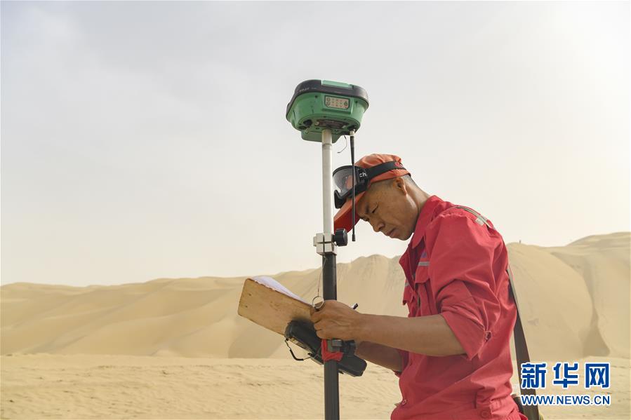 在新疆尉犁至且末沙漠公路施工現(xiàn)場,測繪員劉耀軍在沙山旁測量并標(biāo)注施工線(5月17日攝)。新華社記者胡虎虎攝