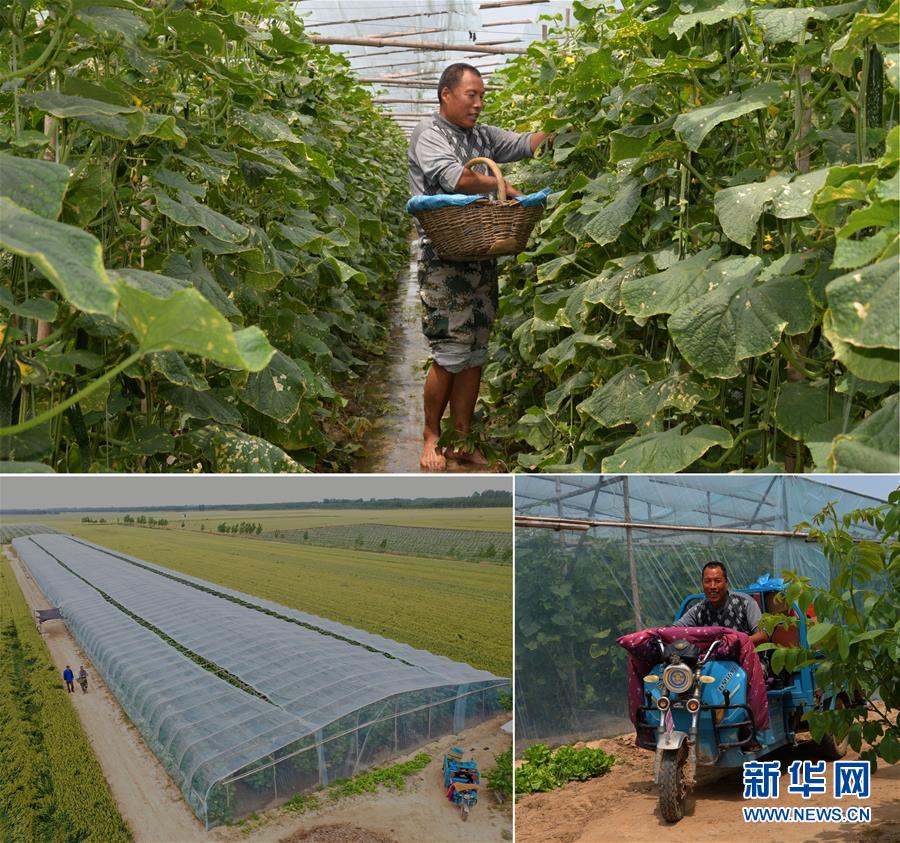 這是一張拼版照片(圖片均為5月16日攝)。上圖:在河南省開封市尉氏縣大橋鄉(xiāng)馮村,50歲的文海軍在他的黃瓜種植大棚內(nèi)采摘黃瓜;下左圖:在扶貧政策扶持下,文海軍蓋了占地6畝的蔬菜溫室大棚(無人機(jī)照片);下右圖:文海軍駕駛?cè)嗆囘\(yùn)輸采摘的黃瓜。新華社記者孫清清攝