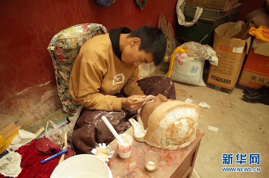 在西藏拉薩市達(dá)孜區(qū),西洛的學(xué)徒旦增扎西在給面具塑形(5月15日攝)。新華社記者格桑邊覺(jué)攝